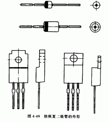 通常,5~20A的快恢复二极管管采用TO–220FP塑料封装,20A以上的大功率快恢复二极管采用顶部带金属散热片的TO–3P塑料封装,5A以下的快恢复二极管则采用DO–41、DO–15或DO–27等规格塑料封装。图4-49是快恢复二极管的外形。