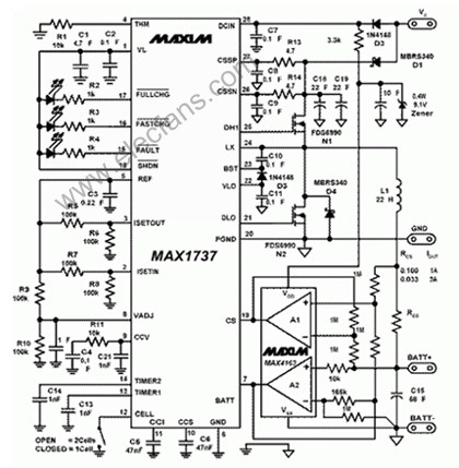 在这种情形下,待充电电池的型号就是由A123系统公司制造的ANR26650m1。它接受工作与3A(1.3C)的标准充电模式,并能够以10A(4.34C)和3.6V的充电端电压进行快速充电。因此,它代表端电压在4.2V至3.6V范围的、新的电池类型。图1所示电路对(原先)给1至4节锂电池充电而设计的IC(MAX1737)的应用电路进行了修改。通过加入微功耗的双运放(MAX4163)以及一些电阻,这个修改让你能够给3.6V的电池充电。