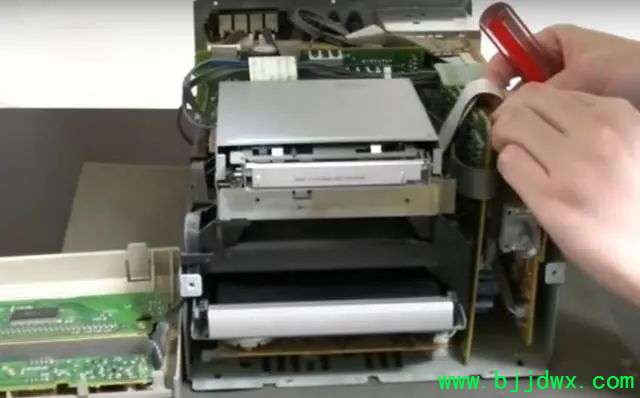 转过机器,背面和机芯塑料板平行的位置有两颗螺丝,把它拆下来。